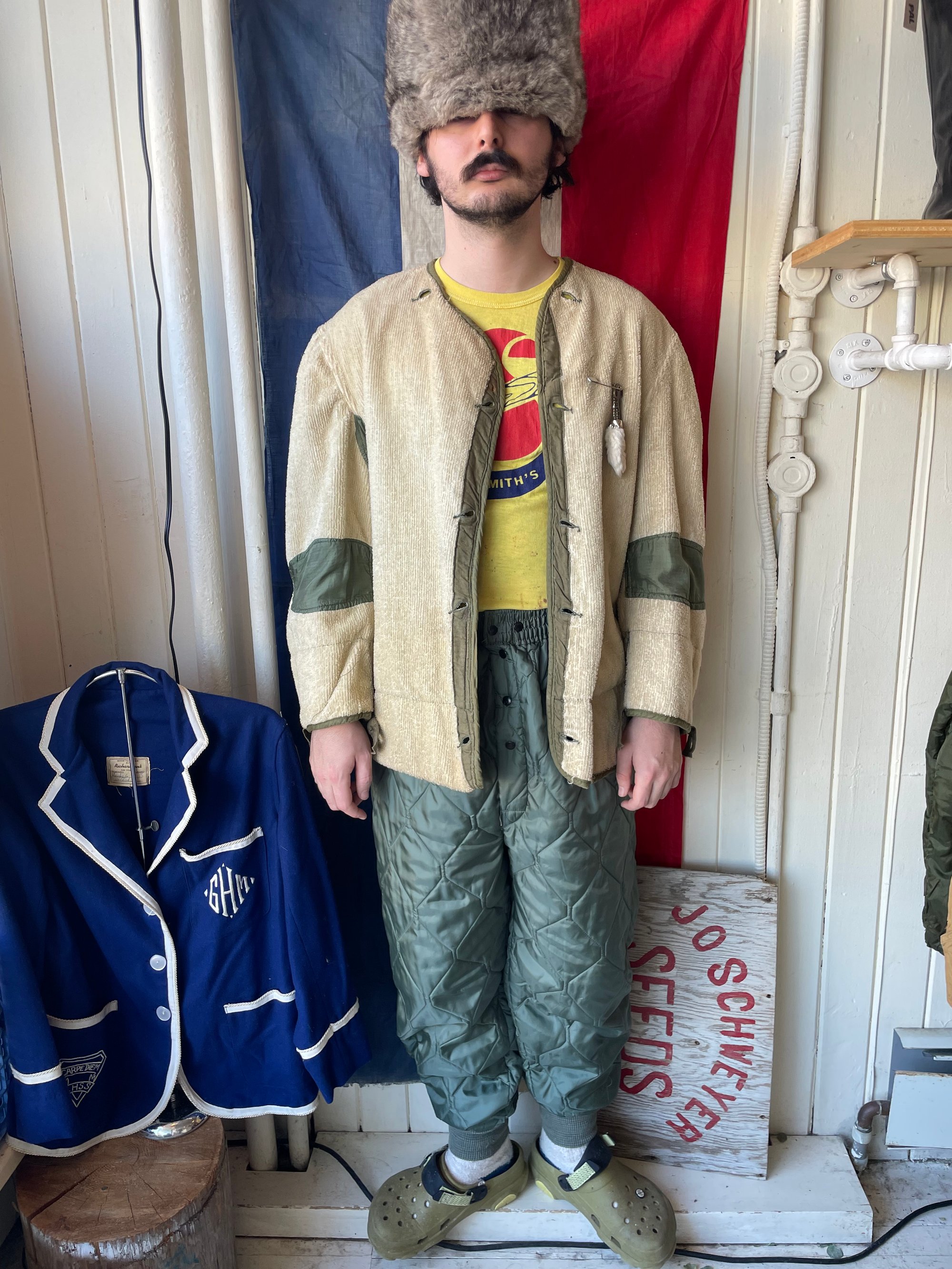 Quilted liner pants with snap enclosure. Elastic waistband.